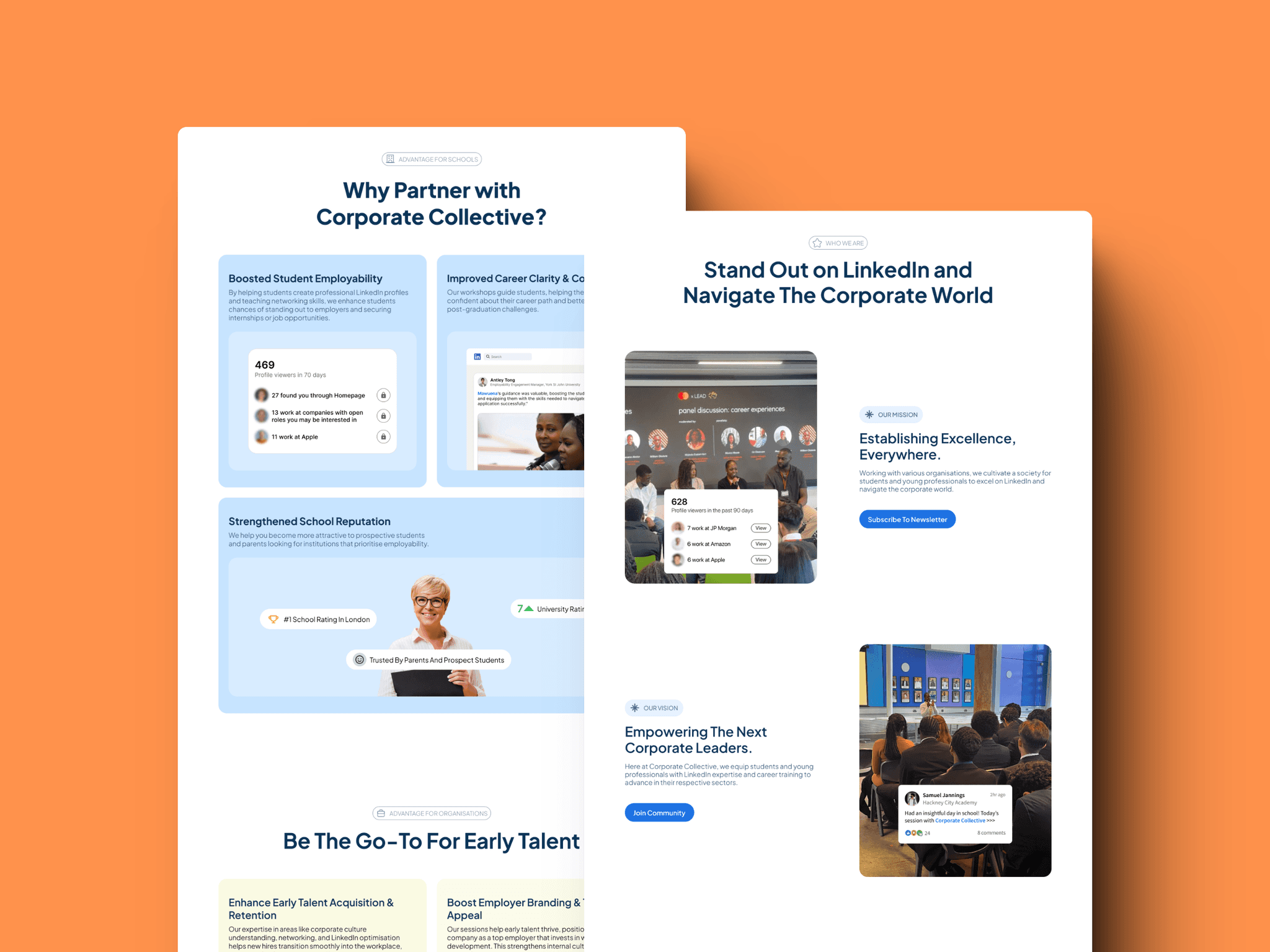 The first version had no call to action which could leave schools and organisations wondering what to do after receiving this information. For those interested in partnering with Corporate Collective, the new design guides schools and organisations to partner with Corporate Collective without hesitation of an unclear experience.