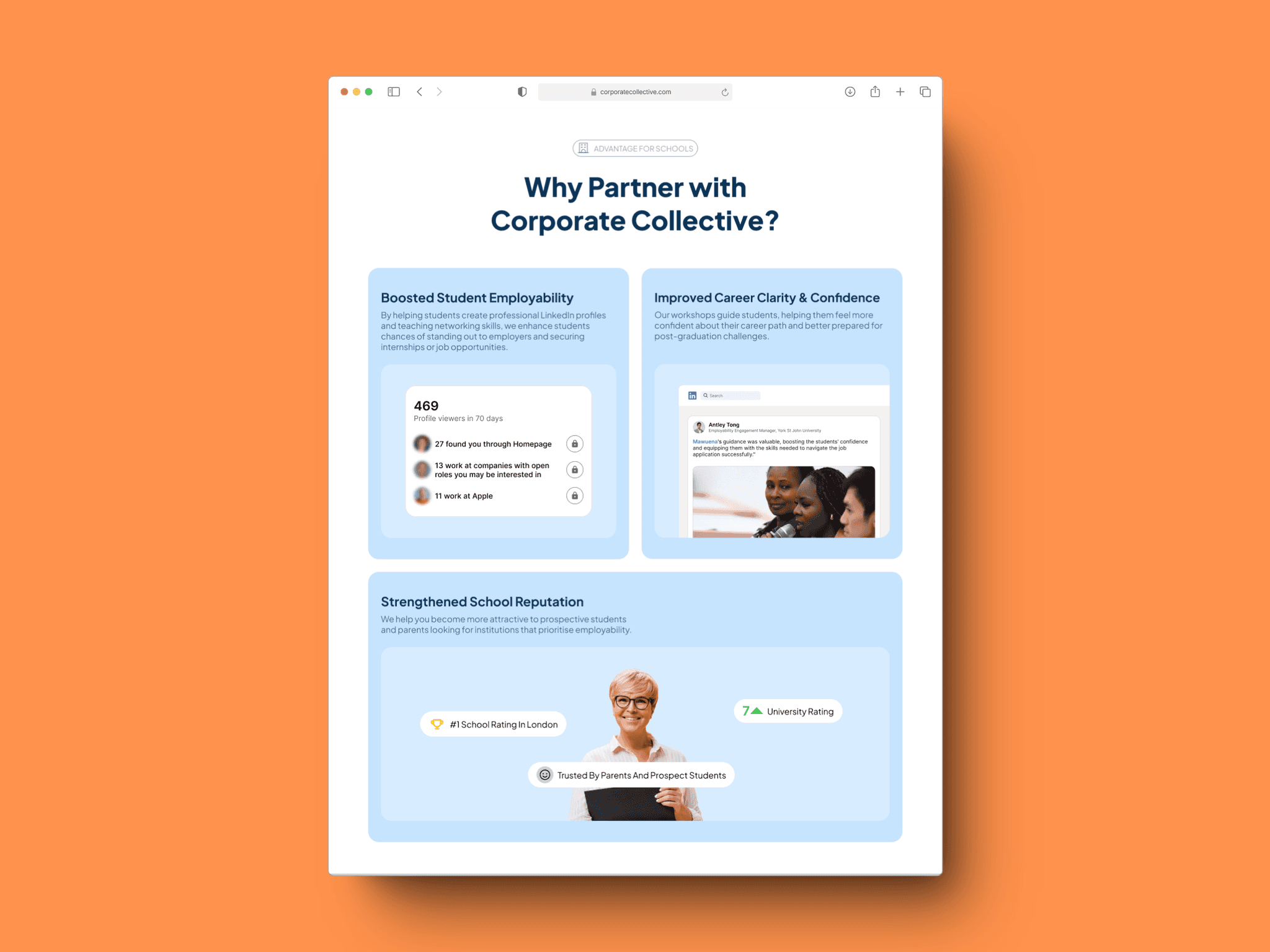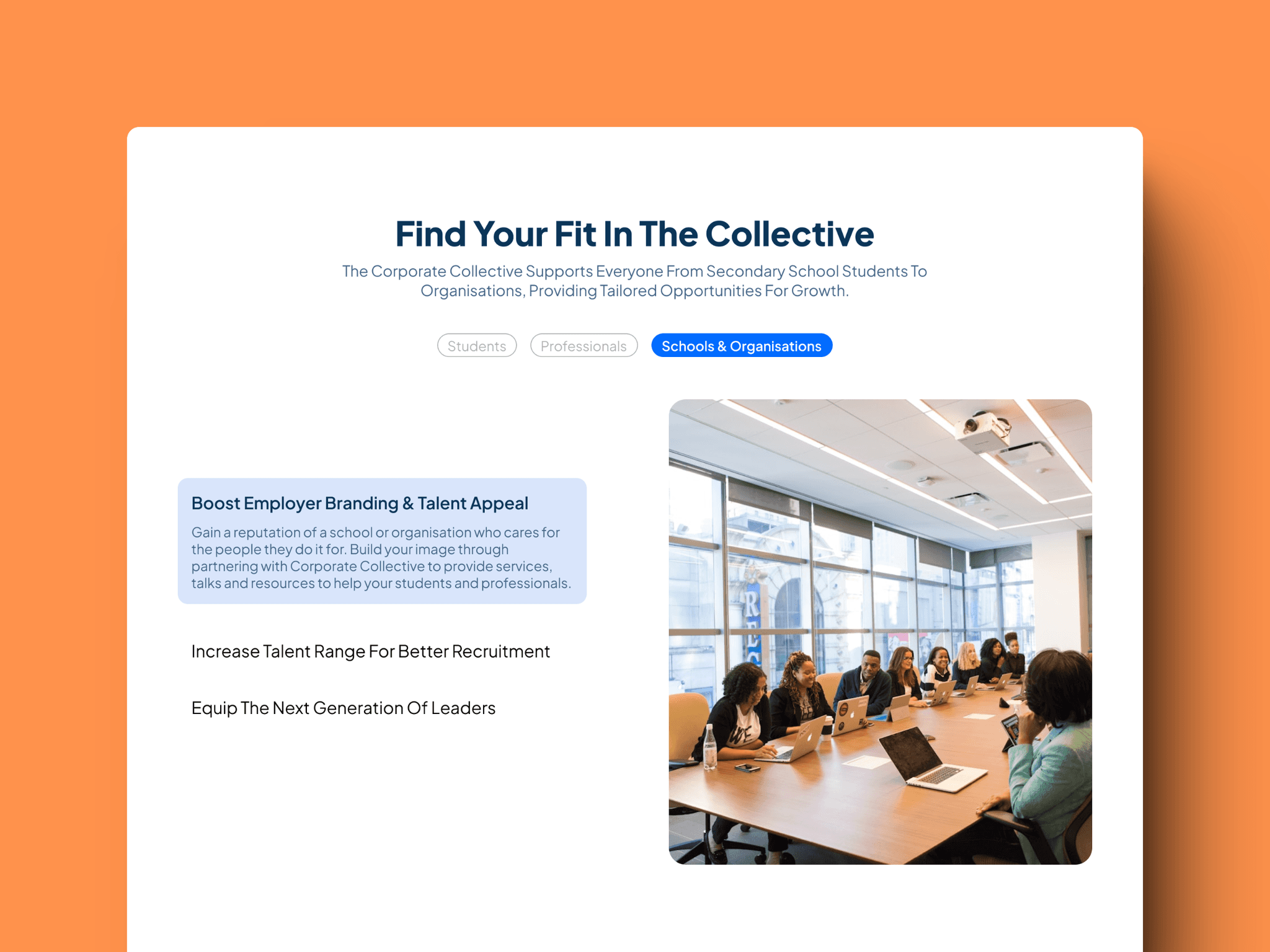This ensured that neither audience felt like an afterthought in Corporate Collective’s targeting. By providing clear, dedicated sections about the benefits of partnering with Corporate Collective, the website delivers more value and creates a stronger sense of appreciation among users.